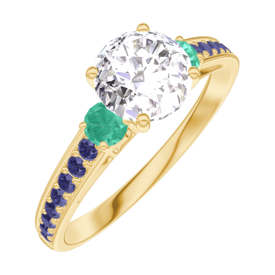 Anello Oro giallo 18 carati - Diamante Rotonda 0.7 Carati - Pietre laterali Smeraldo - Incastonatura Zaffiro blu