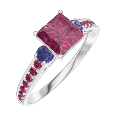 « L'ATELIER » N. 165572Anello Oro bianco 9 carati - Rubino Principessa 0.7 Carati - Pietre laterali Zaffiro blu - Incastonatura Rubino
