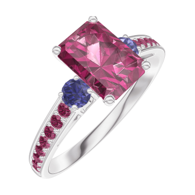 « L'ATELIER » Nº165671Anello Oro bianco 18 carati - Rubino Rettangolo 0.7 Carati - Pietre laterali Zaffiro blu - Incastonatura Rubino