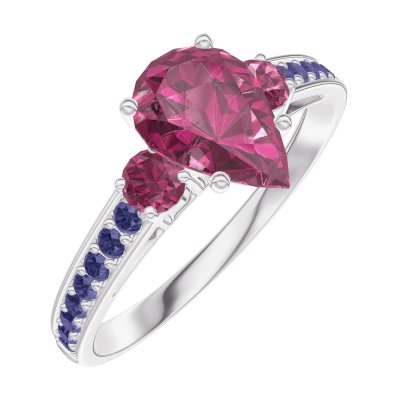 « L'ATELIER » N. 165855Anello Oro bianco 18 carati - Rubino Goccia 0.7 Carati - Pietre laterali Rubino - Incastonatura Zaffiro blu