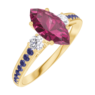 Anello Oro giallo 9 carati - Rubino Marchesa 0.7 Carati - Pietre laterali Diamante - Incastonatura Zaffiro blu