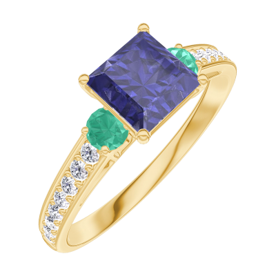 « L'ATELIER » N. 166185Anello Oro giallo 18 carati - Zaffiro blu Principessa 0.7 Carati - Pietre laterali Smeraldo - Incastonatura Diamante