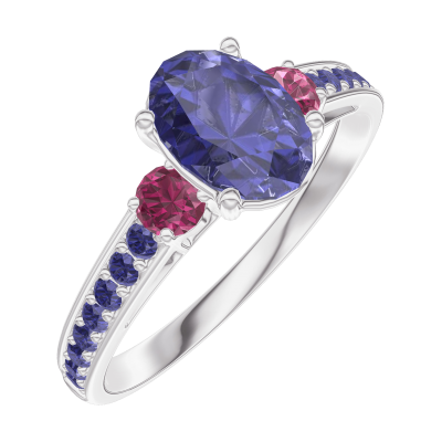 « L'ATELIER » N. 166355Anello Oro bianco 18 carati - Zaffiro blu Ovale 0.7 Carati - Pietre laterali Rubino - Incastonatura Zaffiro blu