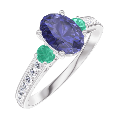 « L'ATELIER » Nº166388Anello Oro bianco 9 carati - Zaffiro blu Ovale 0.7 Carati - Pietre laterali Smeraldo - Incastonatura Diamante