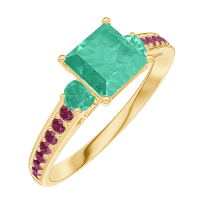 « L'ATELIER » N. 166789Anello Oro giallo 18 carati - Smeraldo Principessa 0.7 Carati - Pietre laterali Smeraldo - Incastonatura Rubino