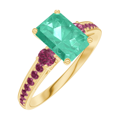 « L'ATELIER » N. 166849Anello Oro giallo 18 carati - Smeraldo Rettangolo 0.7 Carati - Pietre laterali Rubino - Incastonatura Rubino