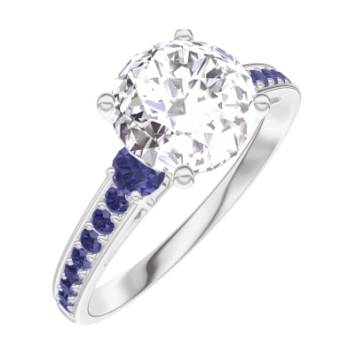 Anello Oro bianco 9 carati - Diamante Rotonda 1 Carati - Pietre laterali Zaffiro blu - Incastonatura Zaffiro blu