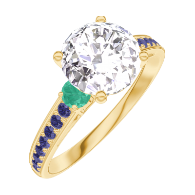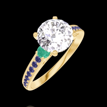 Anello Oro giallo 18 carati - Diamante Rotonda 1 Carati - Pietre laterali Smeraldo - Incastonatura Zaffiro blu