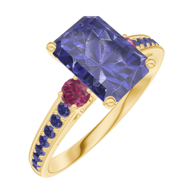 « L'ATELIER » N. 168654Anello Oro giallo 9 carati - Zaffiro blu Rettangolo 1 Carati - Pietre laterali Rubino - Incastonatura Zaffiro blu 4.6
