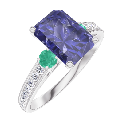 « L'ATELIER » Nº168688Anello Oro bianco 9 carati - Zaffiro blu Rettangolo 1 Carati - Pietre laterali Smeraldo - Incastonatura Diamante 4.6