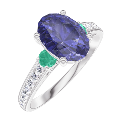 « L'ATELIER » Nº168787Anello Oro bianco 18 carati - Zaffiro blu Ovale 1 Carati - Pietre laterali Smeraldo - Incastonatura Diamante 4.7