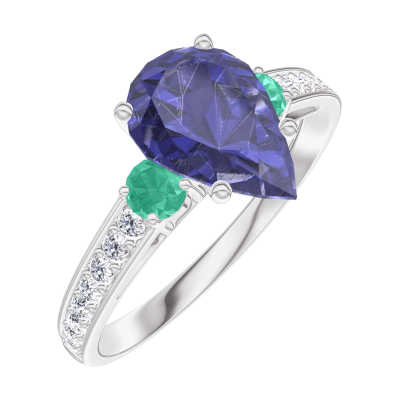 « L'ATELIER » Nº168887Anello Oro bianco 18 carati - Zaffiro blu Goccia 1 Carati - Pietre laterali Smeraldo - Incastonatura Diamante