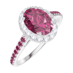 Anello Oro bianco 18 carati - Rubino Ovale 0.5 Carati - Halo Diamante - Incastonatura Rubino