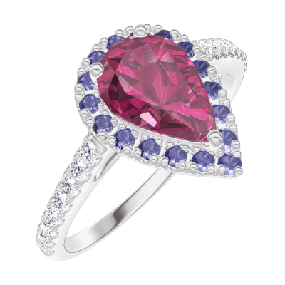 « L'ATELIER » N. 170520Anello Oro bianco 9 carati - Rubino Goccia 0.5 Carati - Halo Zaffiro blu - Incastonatura Diamante 4.8