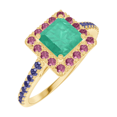 « L'ATELIER » Nº170941Anello Oro giallo 18 carati - Smeraldo Principessa 0.5 Carati - Halo Rubino - Incastonatura Zaffiro blu 4.1 (10)