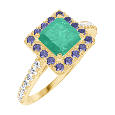 « L'ATELIER » N. 170950Anello Oro giallo 9 carati - Smeraldo Principessa 0.5 Carati - Halo Zaffiro blu - Incastonatura Diamante 4.1