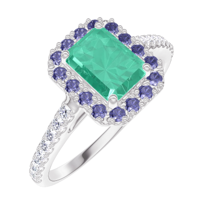 « L'ATELIER » N. 171000Anello Oro bianco 9 carati - Smeraldo Rettangolo 0.5 Carati - Halo Zaffiro blu - Incastonatura Diamante 4.7