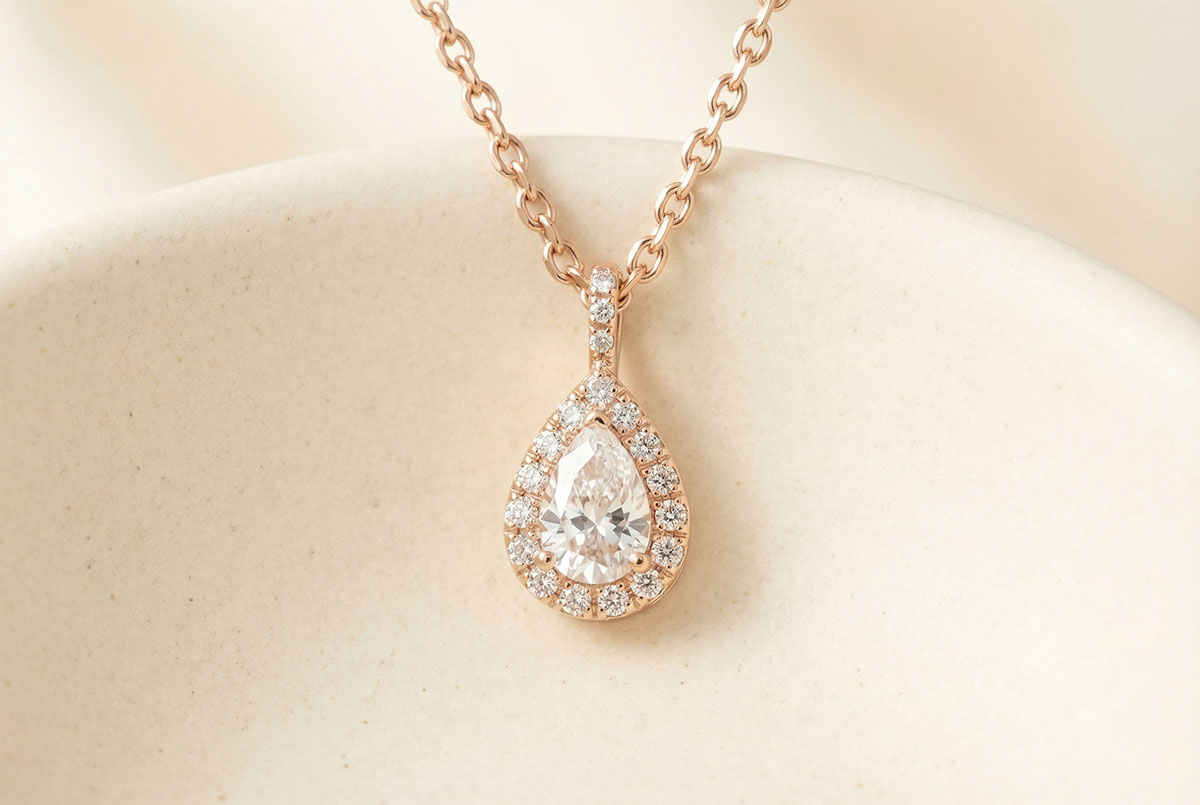 « L'ATELIER » N. 180809Ciondolo Oro rosa 9 carati - Diamante di laboratorio Goccia 0.3 Carati - Halo Diamante di laboratorio - Incastonatura Diamante di laboratorio - Catena Rolò
