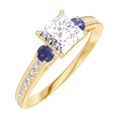 « L'ATELIER » N. 182566Anello Oro giallo 9 carati - Diamante di laboratorio Principessa 0.5 Carati - Pietre laterali Zaffiro blu - Incastonatura Diamante di laboratorio