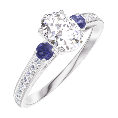 « L'ATELIER » N. 182768Anello Oro bianco 9 carati - Diamante di laboratorio Ovale 0.5 Carati - Pietre laterali Zaffiro blu - Incastonatura Diamante di laboratorio