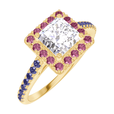 « L'ATELIER » N. 190077Anello Oro giallo 18 carati - Diamante di laboratorio Principessa 0.5 Carati - Halo Rubino - Incastonatura Zaffiro blu 4.1