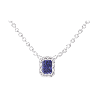 « L'ATELIER » N. 202092Collana Oro bianco 9 carati - Zaffiro blu Rettangolo 0.3 Carati - Halo Diamante - Catena Rolò