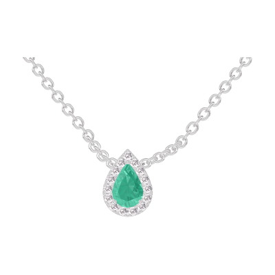 « L'ATELIER » N. 202348Collana Oro bianco 9 carati - Smeraldo Goccia 0.3 Carati - Halo Diamante - Catena Rolò