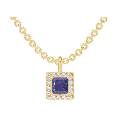 « L'ATELIER » N. 206114Ciondolo Oro giallo 9 carati - Zaffiro blu Principessa 0.3 Carati - Halo Diamante - Catena Rolò