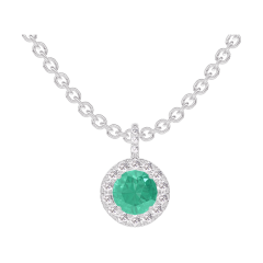 Ciondolo Oro bianco 18 carati - Smeraldo Rotonda 0.3 Carati - Halo Diamante - Incastonatura Diamante - Catena Rolò