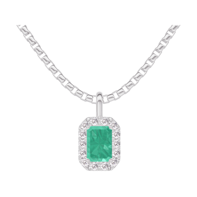 « L'ATELIER » N. 207476Ciondolo Oro bianco 9 carati - Smeraldo Rettangolo 0.3 Carati - Halo Diamante - Catena Veneziana
