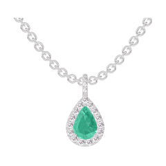 Ciondolo Oro bianco 18 carati - Smeraldo Goccia 0.3 Carati - Halo Diamante - Incastonatura Diamante - Catena Rolò