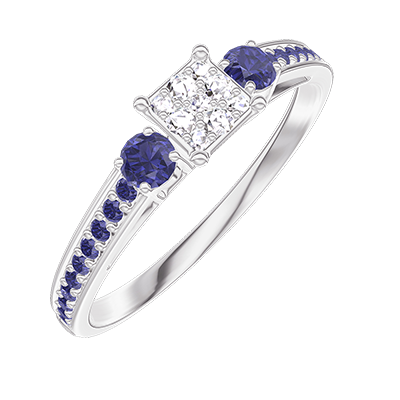 Anello Oro bianco 18 carati - Cluster di diamanti naturali Principessa equivalente 0.3 - Pietre laterali Zaffiro blu - Incastonatura Zaffiro blu