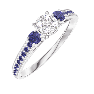 Anello Oro bianco 9 carati - Cluster di diamanti naturali Rotonda equivalente 0.5 - Pietre laterali Zaffiro blu - Incastonatura Zaffiro blu