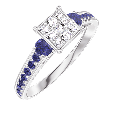 Anello Oro bianco 9 carati - Cluster di diamanti naturali Principessa equivalente 0.7 - Pietre laterali Zaffiro blu - Incastonatura Zaffiro blu