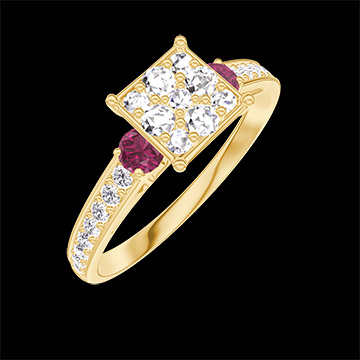 « L'ATELIER » N. 210946Anello Oro giallo 9 carati - Cluster di diamanti naturali Principessa equivalente 1 - Pietre laterali Rubino - Incastonatura Diamante
