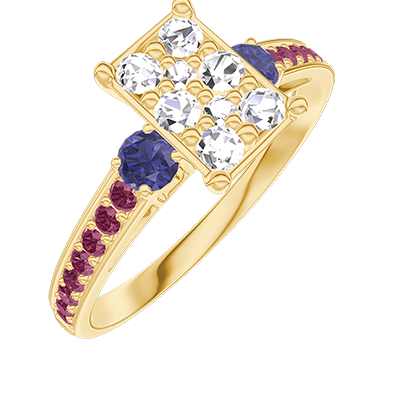 « L'ATELIER » N. 211069Anello Oro giallo 18 carati - Cluster di diamanti naturali Rettangolo equivalente 1 - Pietre laterali Zaffiro blu - Incastonatura Rubino 4.6 (5)