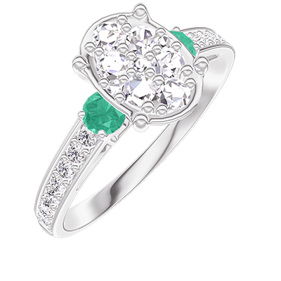 « L'ATELIER » N. 211188Anello Oro bianco 9 carati - Cluster di diamanti naturali Ovale equivalente 1 - Pietre laterali Smeraldo - Incastonatura Diamante 4.7