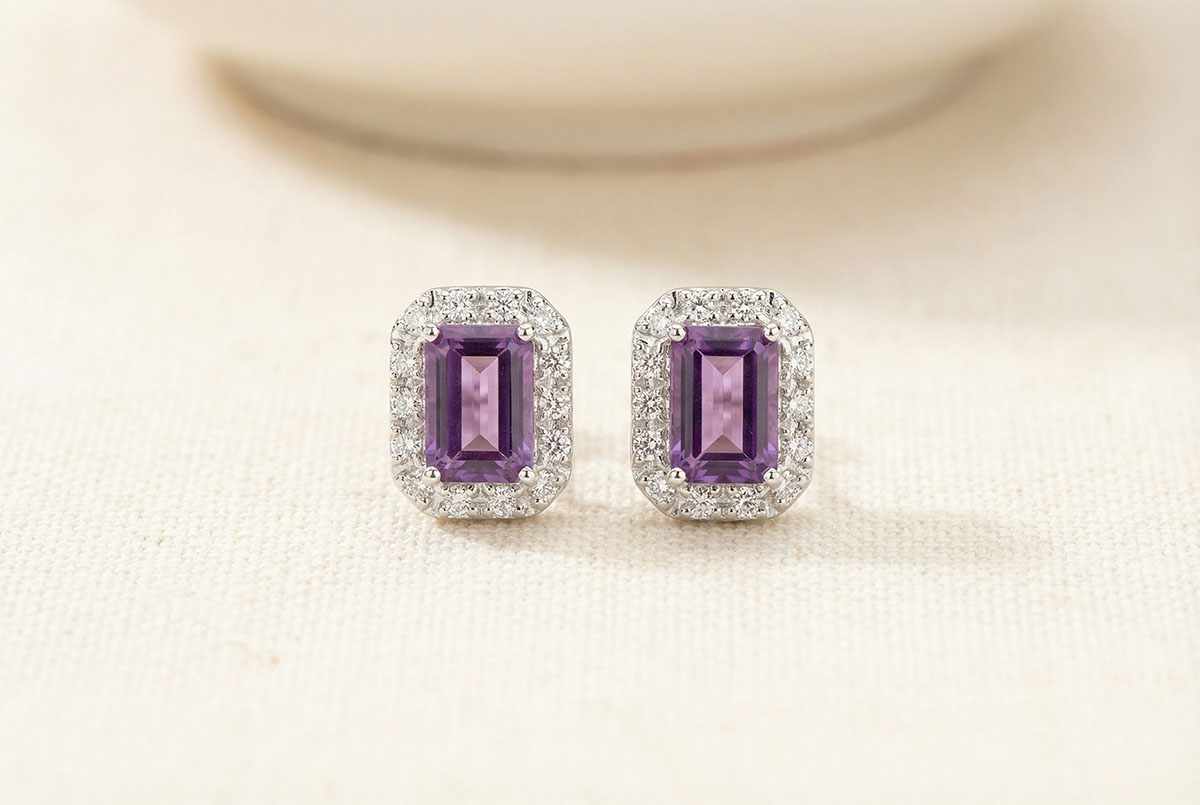 « L'ATELIER » N. 218815Orecchini Oro bianco 9 carati - Ametista Rettangolo 0.3 Carati (2 X) - Halo Diamante