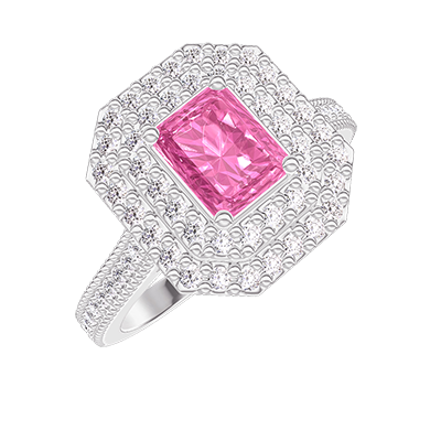 « L'ATELIER » Nº416342Anello Oro bianco 9 carati - Zaffiro rosa Rettangolo 0.5 Carati - Halo Diamante - Incastonatura Diamante