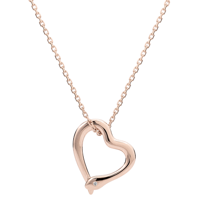 Un serpente in oro rosa si avvolge attorno a una catena sottile e femminile fino a formare un cuore.