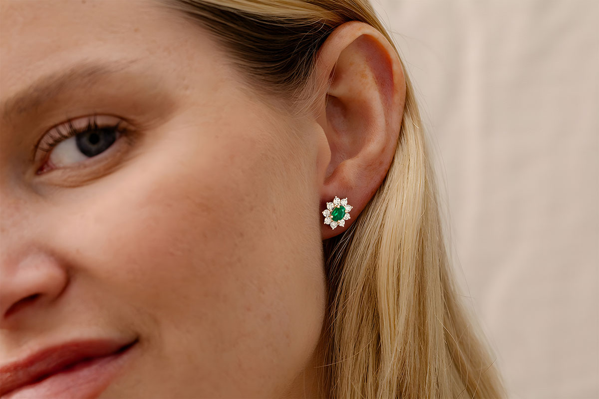 Su ogni orecchino, uno smeraldo ovale diviene il centro di un prezioso fiore in Oro bianco con i petali tempestati di diamanti.