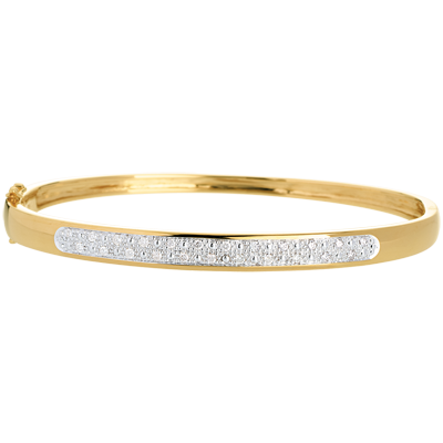 Lo splendore iridescente di un raffinato pavé di diamanti su un bracciale rigido dal design essenziale e delicato.