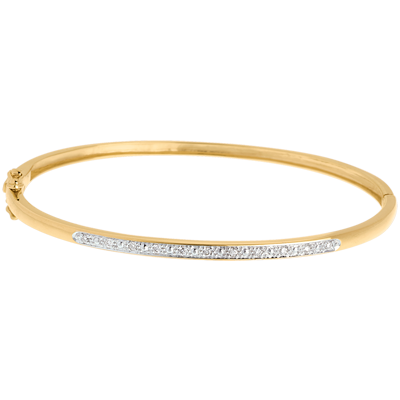 Lo splendore iridescente di un raffinato pavé di diamanti su un bracciale rigido dal design essenziale e delicato.