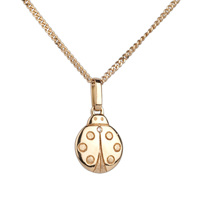 Una coccinella portafortuna in Oro giallo dolce e tonda. Il settimo puntino sulle ali è un diamante. Modello piccolo.