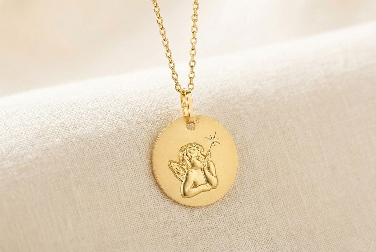 Una medaglietta tondeggiante raffigura il dolce angelo di Raffaello, pensieroso mentre guarda una stella. Una medaglietta simbolo di protezione.