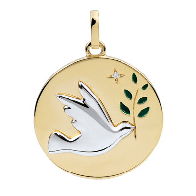 Medaglia Colomba con ramoscello - Oro bianco e Oro giallo - 9 carati - Lacca verde - 1 Diamante