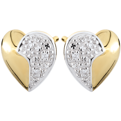 Un paio di orecchini a cuore bicolori in Oro giallo e bianco, accompagnati dallo scintillio dei diamanti.