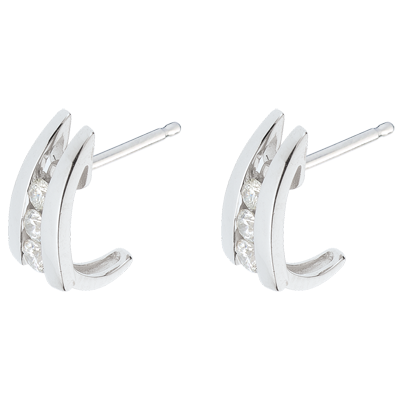 Una coppia di orecchini in Oro bianco con trilogia di diamanti dalla forma ricurva, per aggrapparsi all'amore.
