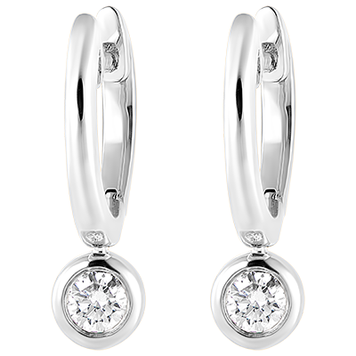 Una paio di orecchini creoli in oro bianco il cui piccolo pendente con diamante scintilla delicatamente a ogni movimento.