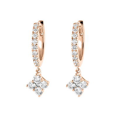 Un paio di orecchini creoli in oro rosa semi-pavé diamanti il cui pendente, impreziosito da 5 diamanti, aggiunge un tocco prezioso e moderno. Pendente di 5.95mm di lato e di 3.20mm di spessore.
